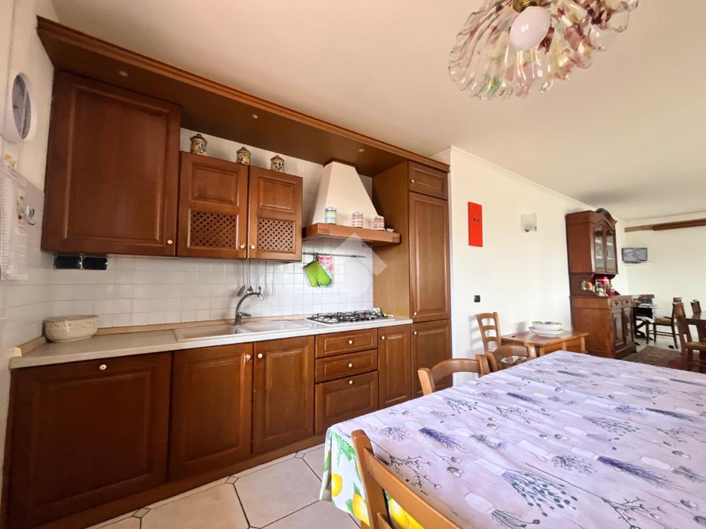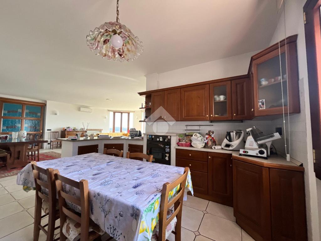 L'ampia zona giorno è composta di un salone di circa sessanta metri quadri con appunto queste vetrate che consentono un accesso naturale della luce; una cucina abitabile, completa la zona giorno.